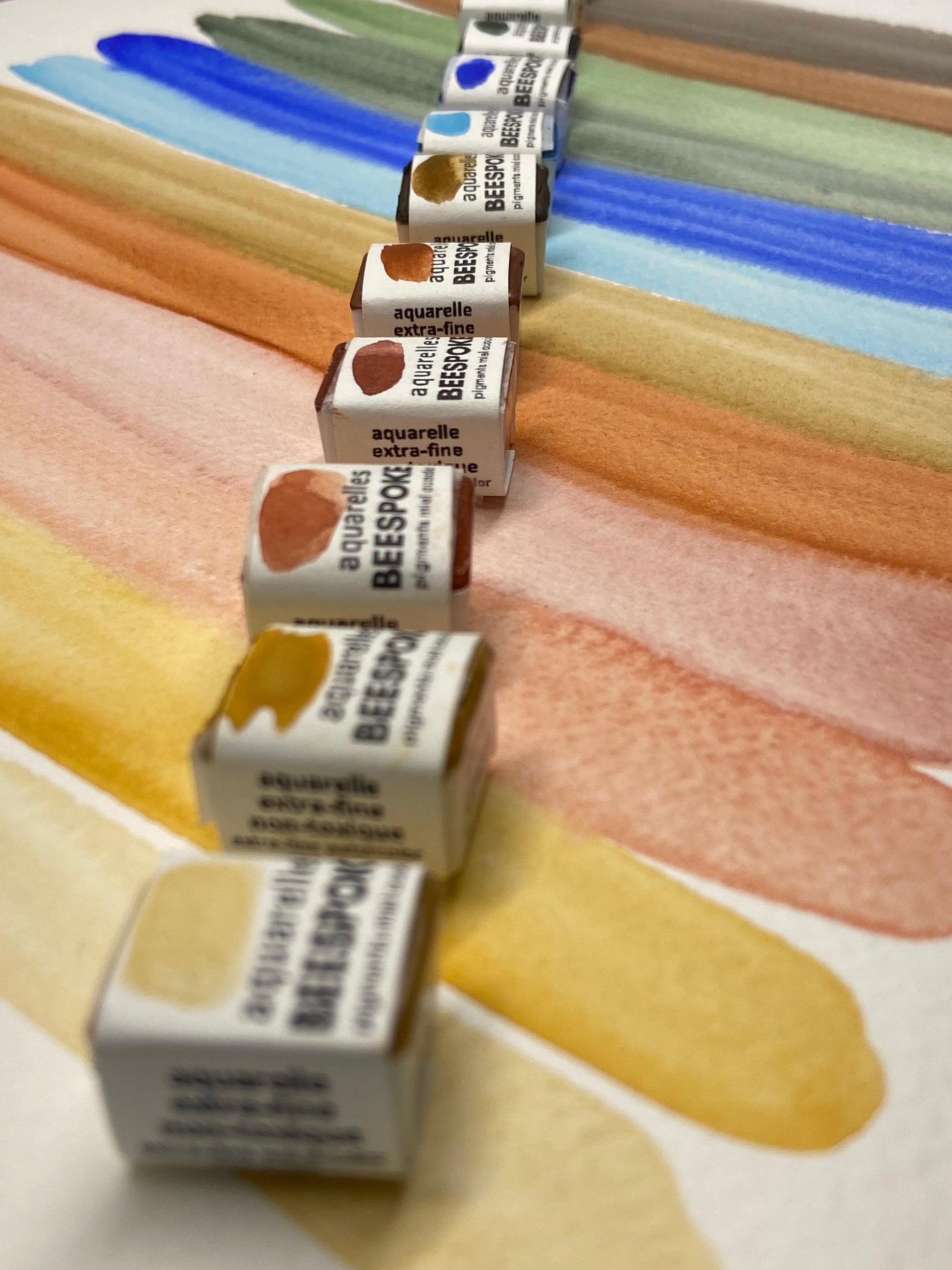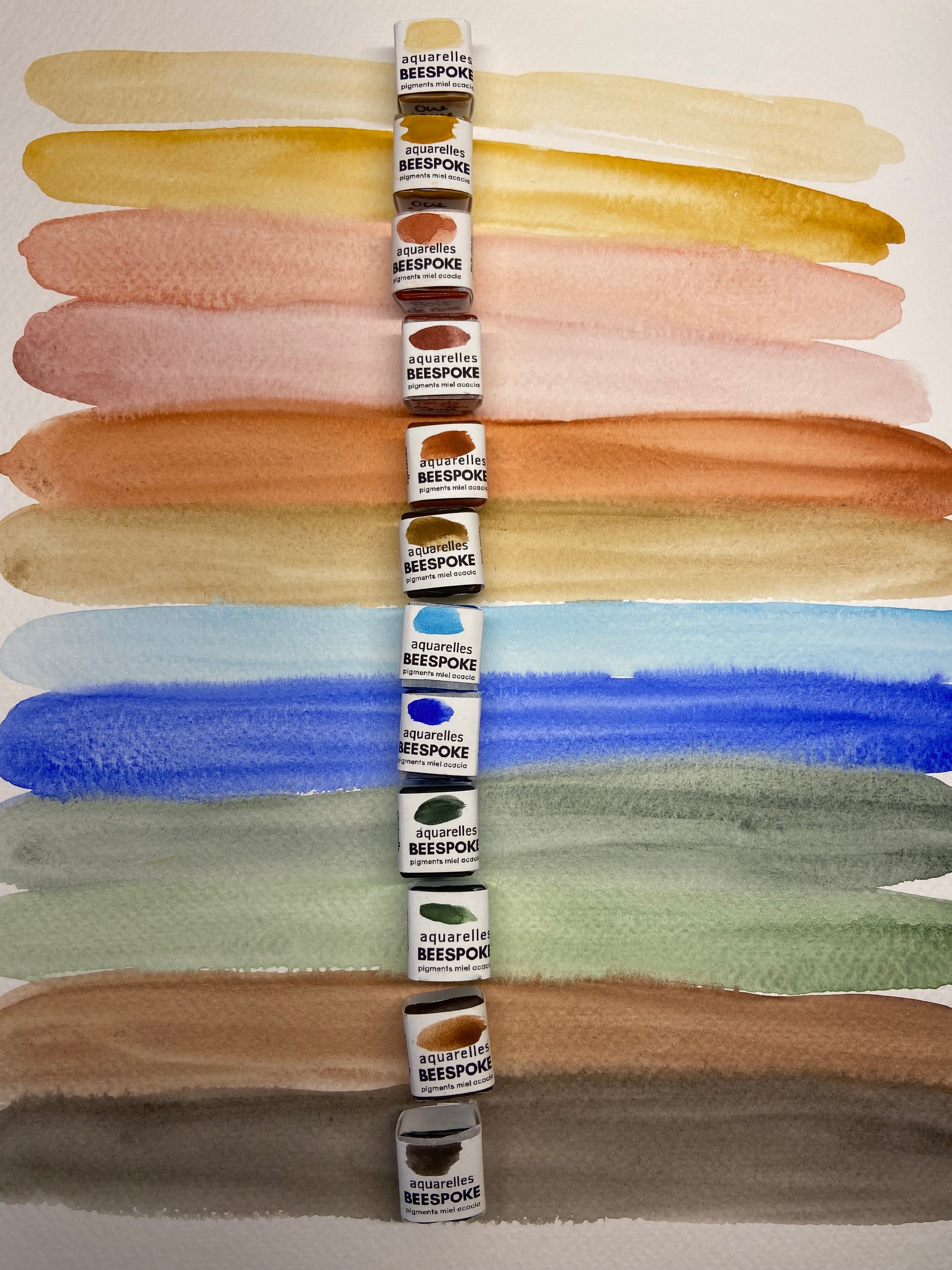 De par leur nature artisanale, les godets d'aquarelle peuvent contenir des petites bulles d'air, des craques ou d'autres variations normales. Ceci n'altère en rien la qualité de la peinture.