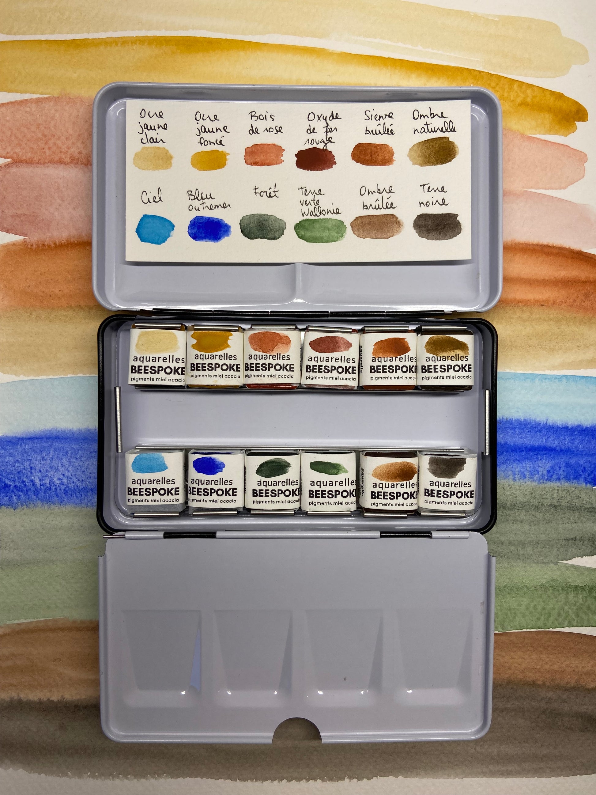 Assortiments de 12 demi-godets d’aquarelles extra-fines artisanale à base de miel dans un coffret en métal portatif muni de 2 espaces de mélange.